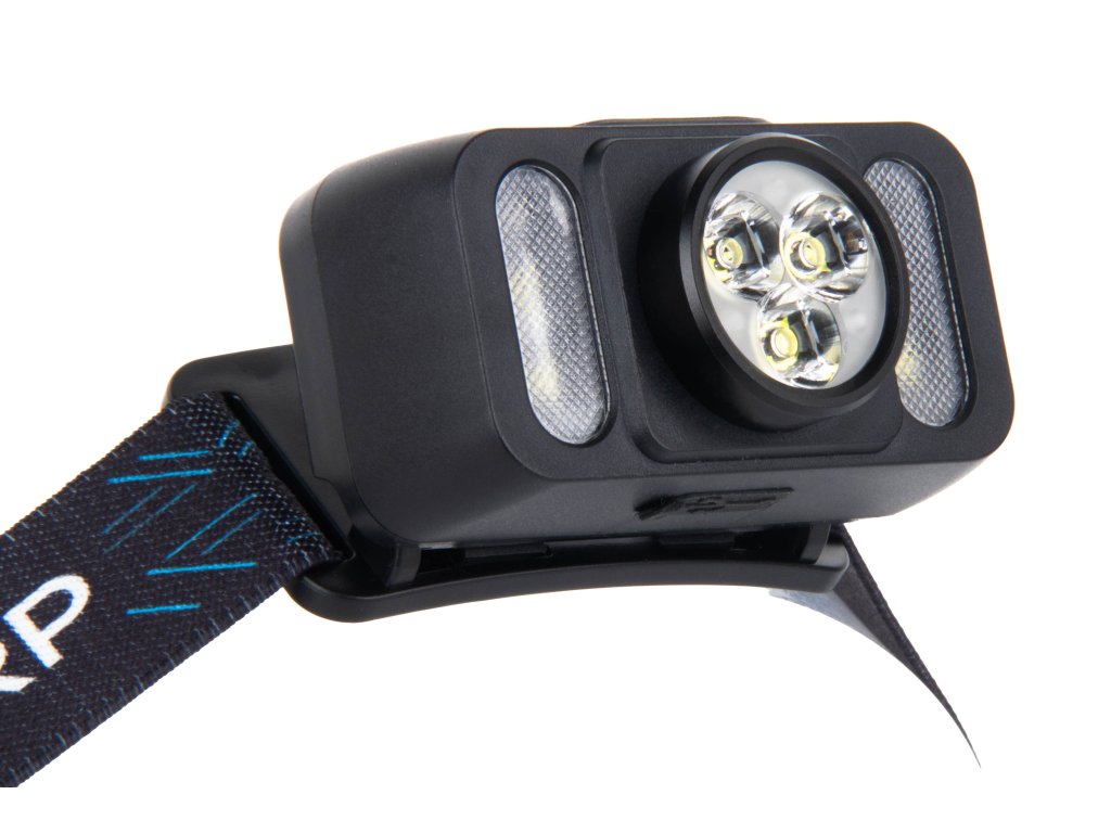 Ovládání: Pravé tlačítko pro ovládání hlavního LED reflektoru (přepínání ve více úrovních svítivosti + Turbo režim pro intenzivní svit do dálky). Levé tlačítko pro ovládání postranních LED (teplá bílá LED, vhodná pro krátký dosvit, příjemné světlo pro práci i čtení + prostorová zelená i červená LED pro noční vidění).